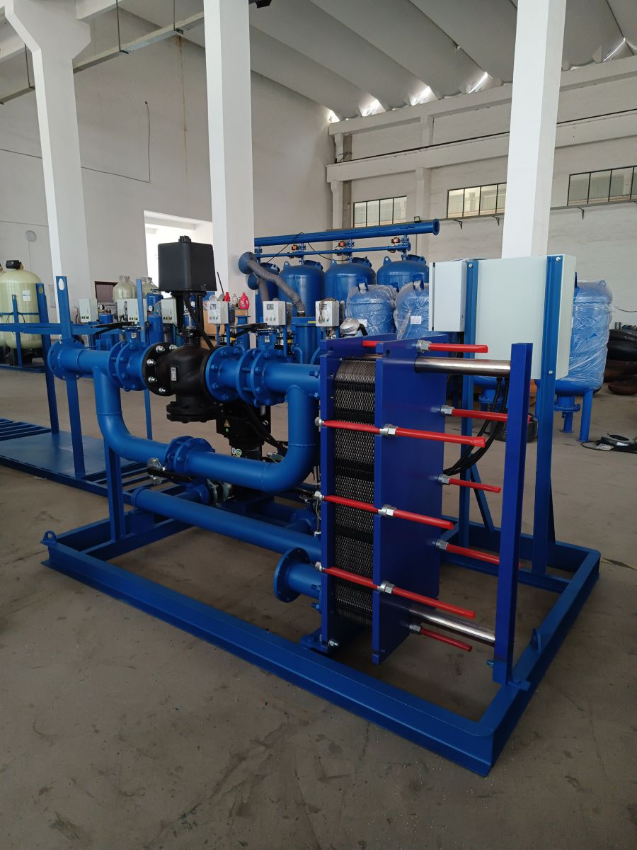 板式換熱機組,為換熱機組的一種型號,其特點是采用板式換熱器,在相同壓力損失情況下,其傳熱系數比管式換熱器高3-5倍,占地面積為管式換熱器的三分之一,熱回收率高。設備由板式換熱器、智能溫控裝置、智能電控裝置、循環(huán)泵、補水泵、穩(wěn)壓膨脹水箱、補(凝)水箱、過濾器、閥門、儀表、傳感器、配管底座等組成。