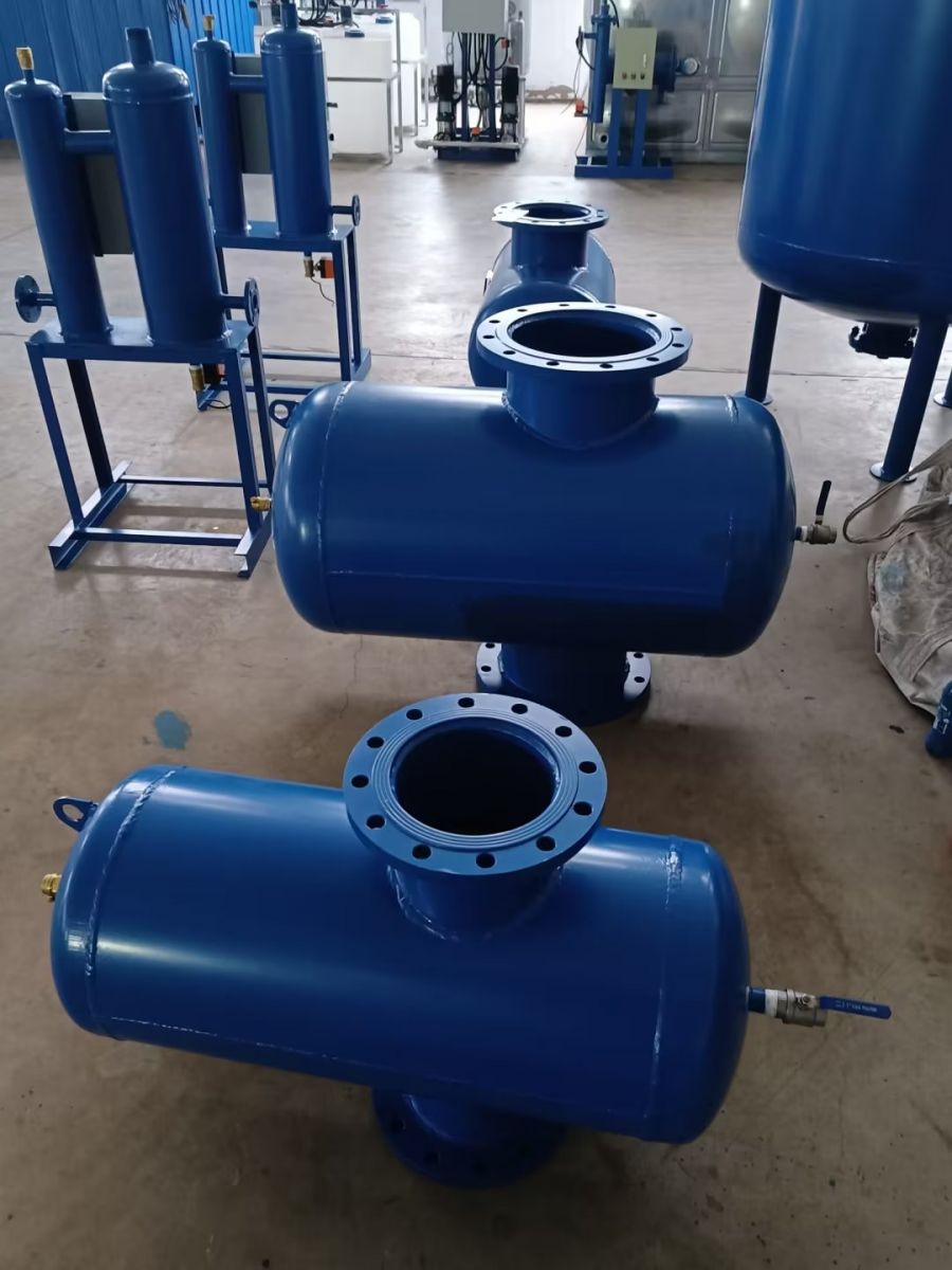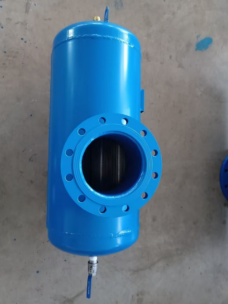 螺旋排氣除污器利用氣水分離、沉降、過(guò)濾等機(jī)理。當(dāng)冷卻水、熱水、冷凍水系統(tǒng)中水進(jìn)入螺旋脫氣過(guò)濾器時(shí),體積擴(kuò)大,流速急劇降低,水中氣泡分離上升至聚氣區(qū),小氣泡吸附在分離板上,當(dāng)形成大氣泡上升至聚氣區(qū)后通過(guò)自動(dòng)排氣閥排除。
