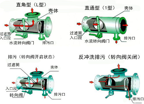 該過濾器由殼體、不銹鋼過濾筒網(wǎng)、雜質(zhì)收集段、雜質(zhì)排出口及水流轉(zhuǎn)向閥組成。按安裝型式及水流方向的不同分為直通式和直角式兩種。