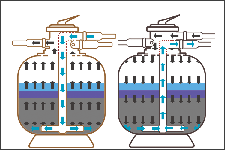正洗過濾狀態(tài):當(dāng)系統(tǒng)處于過濾狀態(tài)時,未經(jīng)過濾的水通過自行研制獨(dú)特的布水器均勻布水,水以層流狀態(tài)通過濾器內(nèi)的填料層(精制均粒石英砂/石榴石)。當(dāng)水流過填料層時,雜質(zhì)被截留在填料層內(nèi)。過濾器底部有多個均勻分布的集水器,將過濾后的水均勻地收集并引出,平流過濾,可以使過濾器在高流速下過濾,仍可達(dá)到較好過濾的效果。