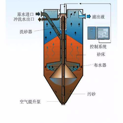 在空壓機(jī)的作用下,空氣提升泵將過(guò)濾器底層被污染的臟砂提升至過(guò)濾器頂部的洗砂器中,通過(guò)水流的紊流作用將砂表面的污染物分離出。清洗后的凈砂利用自重返回到砂床中,而清洗砂所產(chǎn)生的污水從過(guò)濾器的排污口排出。